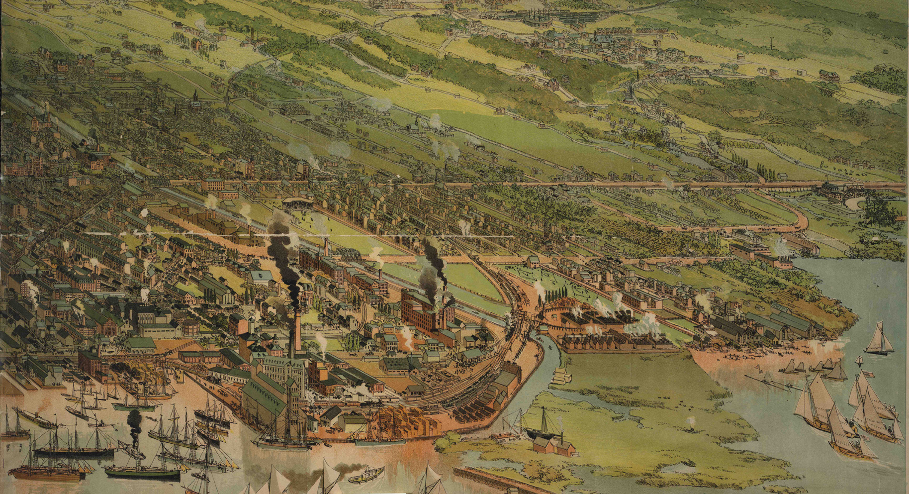 This image illustrates the amount of industry congregated along the Lower Don by the end of the 19th century. Note especially the oil refinery east of the bend near the river’s mouth, and the Gooderham & Worts cattle sheds across the river on the north-west bank.
