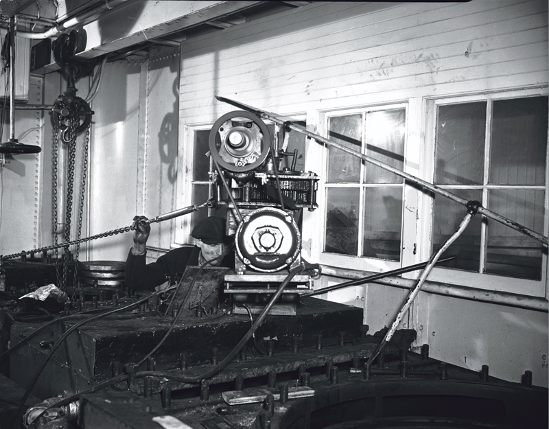 Image of man wearing black hat hunching behind engine on "Cayuga" ship