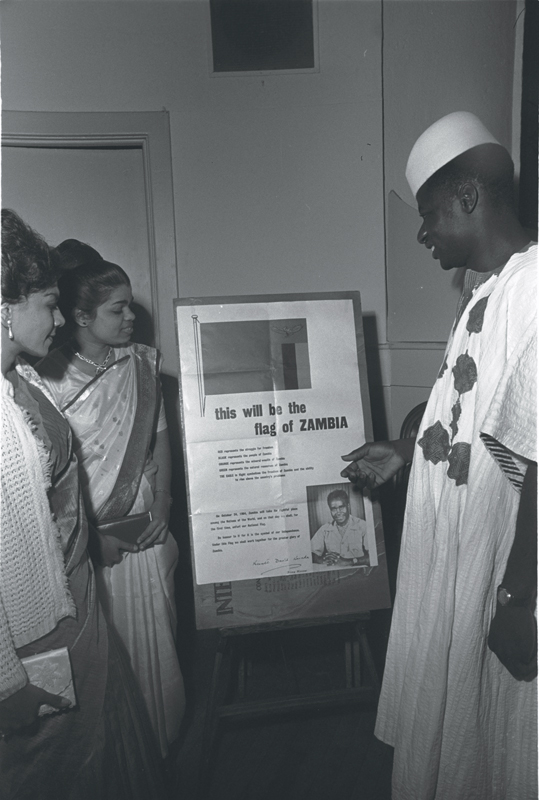 Image of two women and man, who is wearing traditional African dress, looking at a poster, displayed on an easel, which features an image of a flag and reads: "This will be the flag of Zambia" displayed on an easel