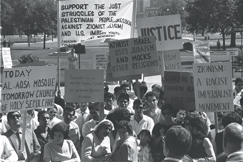Image of demonstrators at Queen's Park, some carrying placards, one of which reads "Support the just struggles of the Palestinian people against Zionist aggression and U.S. imperialism"
