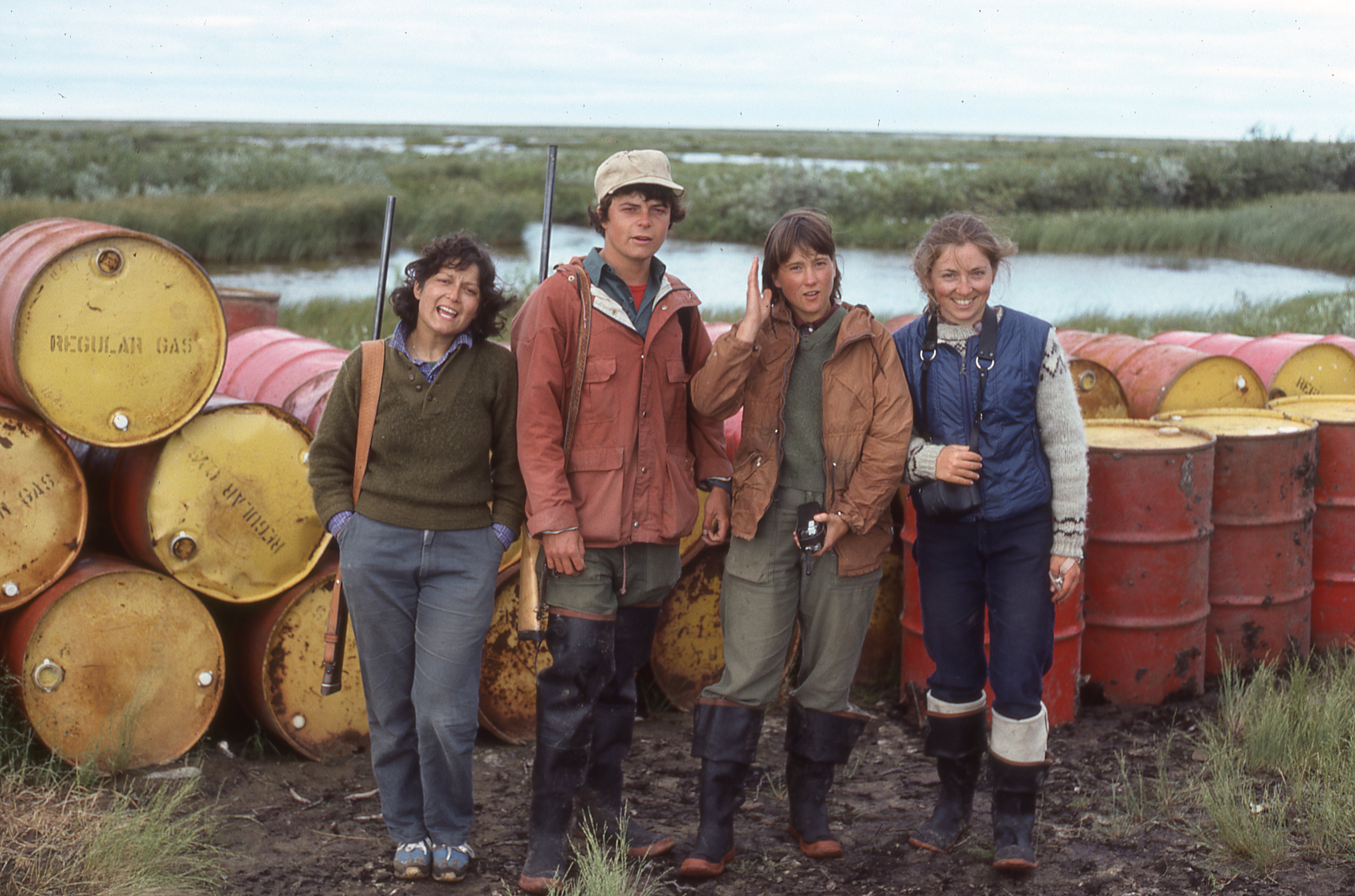 Dawn R. Bazely, John Reynolds, Sue and another Field researcher stand together at Camp Finney,Wapusk National Park in front of many gas drums. Just beyond the gas drums a water body and large expanses of grassland can be seen