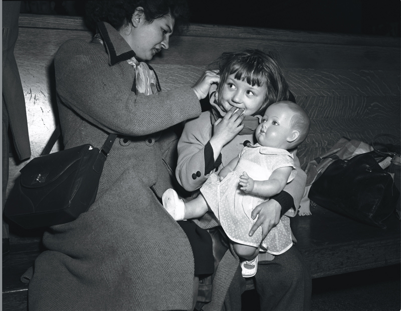 Image of woman adjusting coat collar of girl, holding doll in left arm and fingers of right hand to mouth