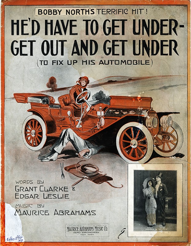 Man under car, woman; photo:Percy Bronson & Minnie Baldwin [illustration]