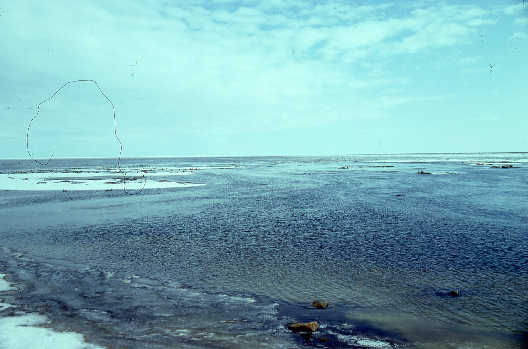 Mast River in flood stage near the R-chain islands in Churchill, Manitoba, 1978.