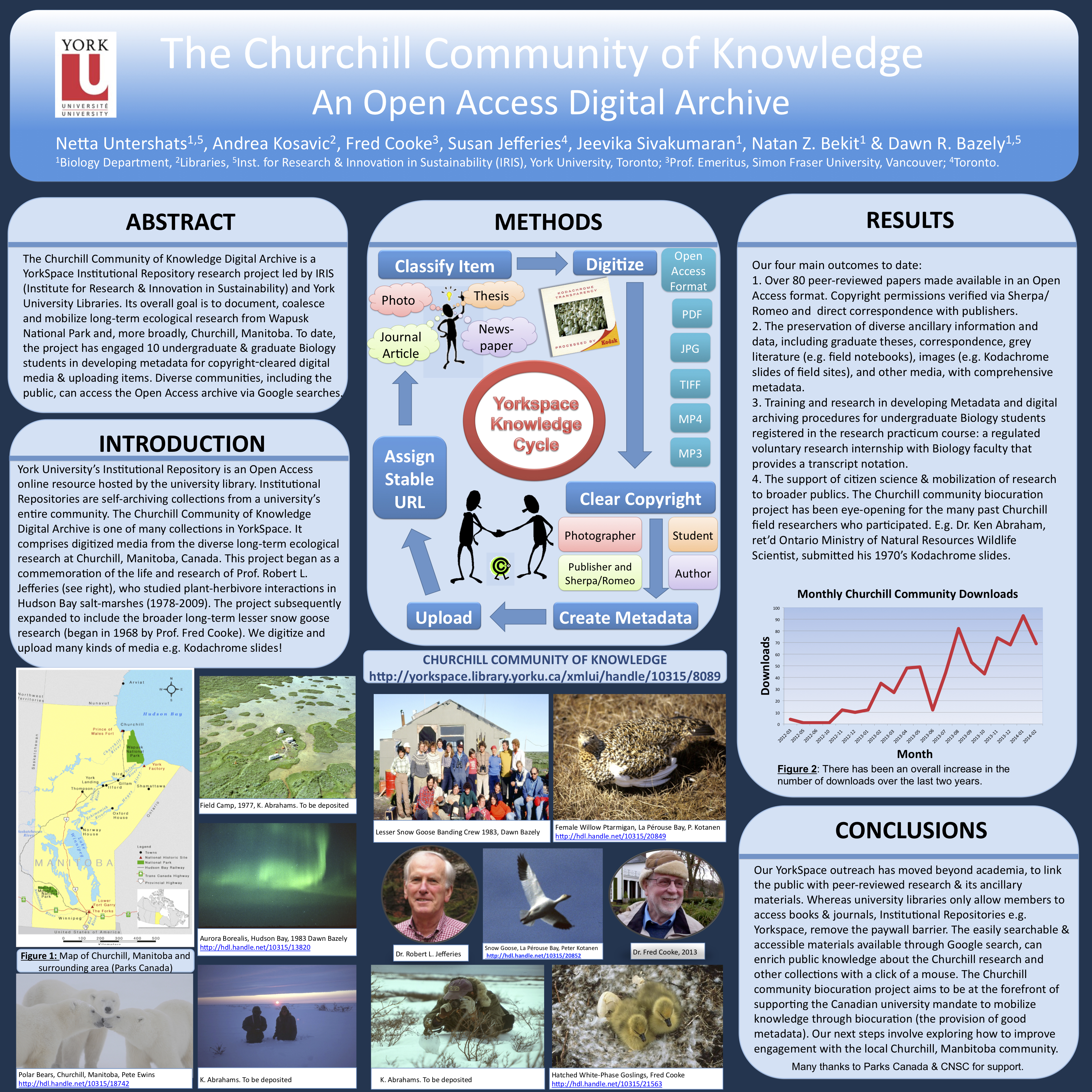 The Churchill Community of Knowledge Digital Archive is a YorkSpace Institutional Repository research project led by IRIS (Institute for Research & Innovation in Sustainability) and York University Libraries. Its overall goal is to document, coalesce and mobilize long-term ecological research from Wapusk National Park and, more broadly, Churchill, Manitoba. To date, the project has engaged 10 undergraduate & graduate Biology students in developing metadata for copyright‑cleared digital media & uploading items. Diverse communities, including the public, can access the Open Access archive via Google searches