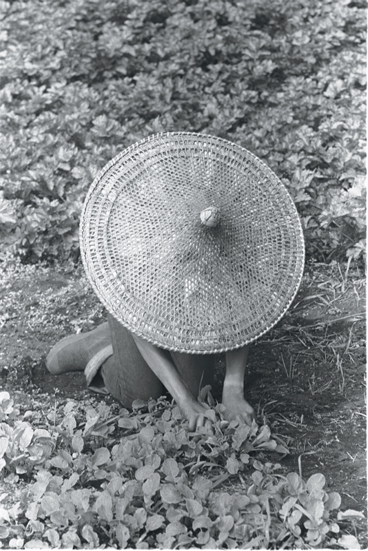 Image of person wearing wide-brimmed peaked straw hat, kneeling in field with head bent down, picking leafy vegetables