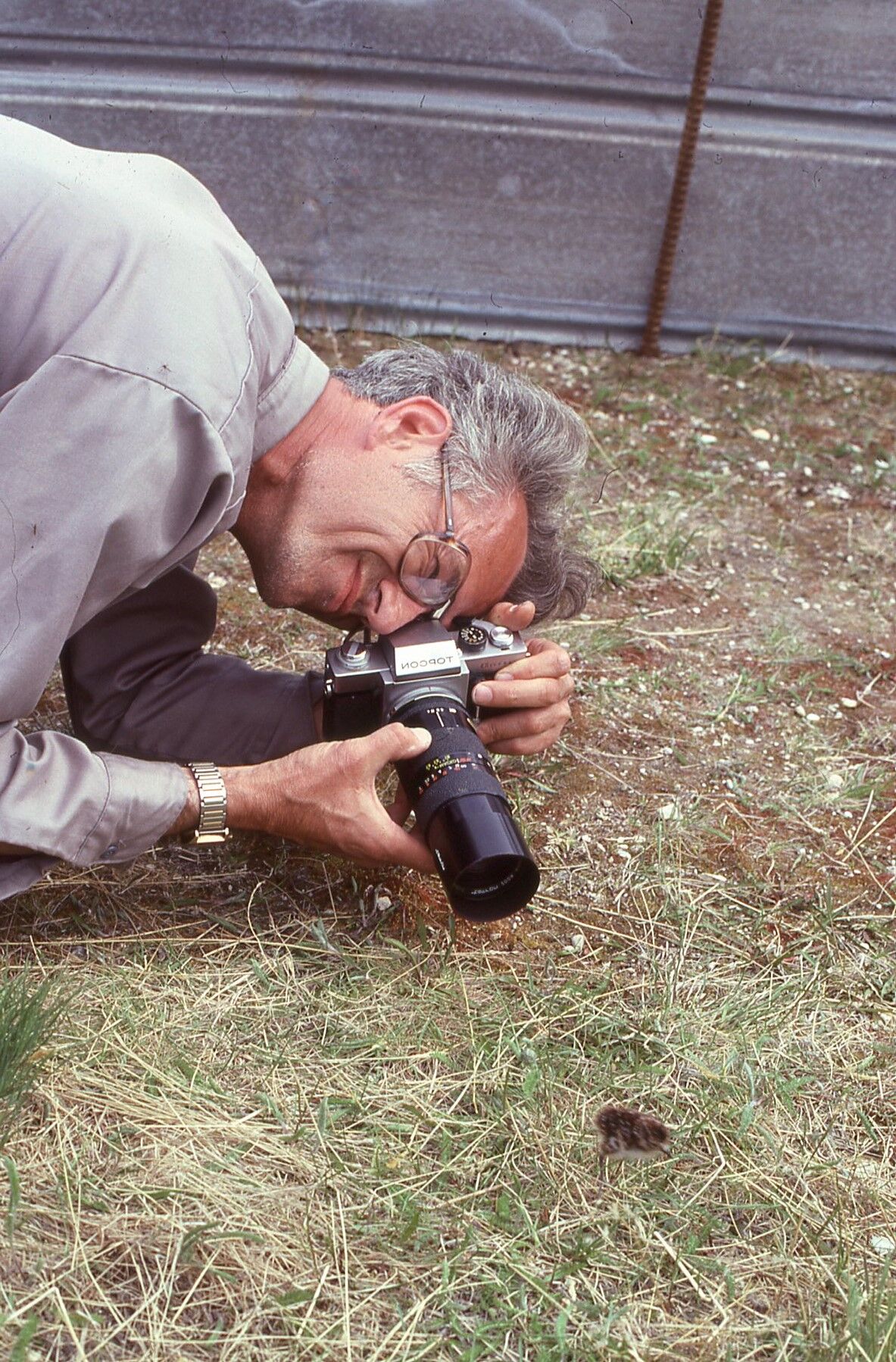 Paul Johnsgard, photographing, shorebird chick. Johnsgard was a scientist/author staying at the new Chuchill Northern Studies Centre in one of its first years, in the year 1967.