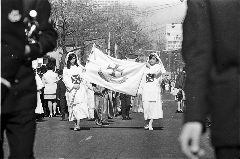 dc.description | Image of two women in traditional costume parading down a street holding a large white flag with a cross on it. | en_US |