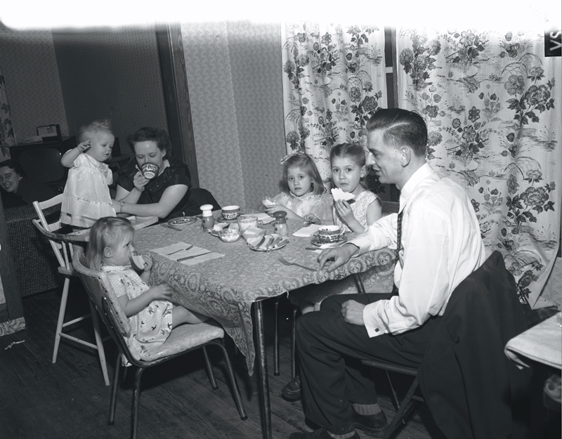 Image of woman, man, infant, and three girls eating sandwiches, sitting in mismatched chairs at dining table with infant standing on seat of highchair