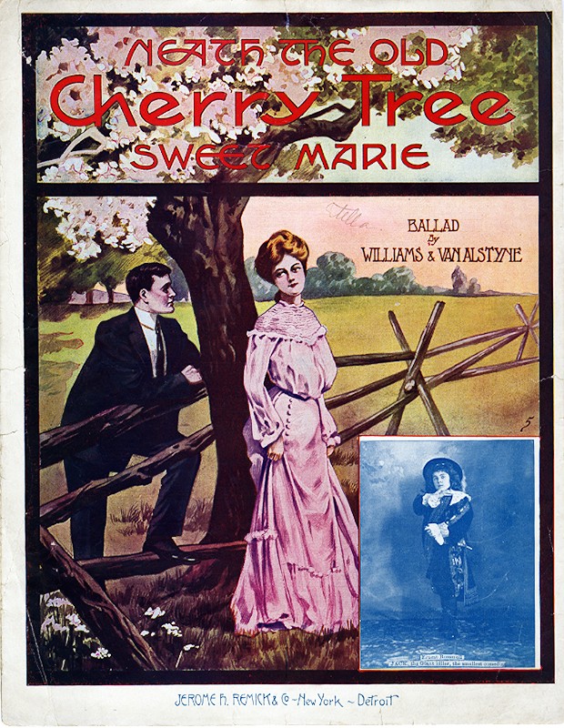Woman & man standing by fence under a cherry tree ; photograph: Ernest Rommell [illustration]