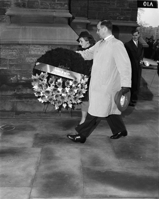 Image of man and woman holding a wreath with a ribbon that says "Province of Ontario;" a man with a camera stands by them.