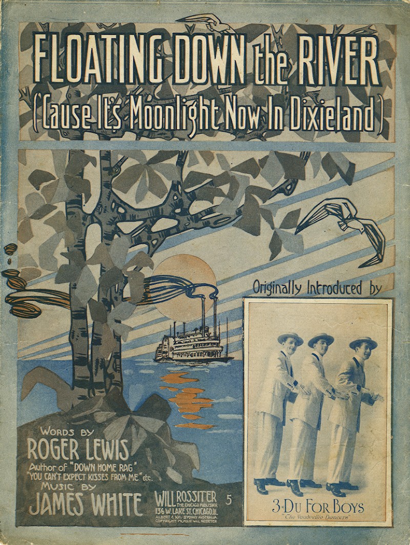 Floating down the river: (cause it's moonlight now in Dixieland).