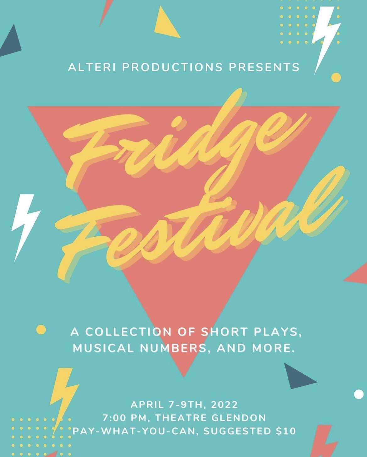 The archival file of Alteri Production's annual "Fridge Festival". The festival showcases various plays, songs, dances, etc. from student writers and directors. This festival ran from April 7-9th 2022.