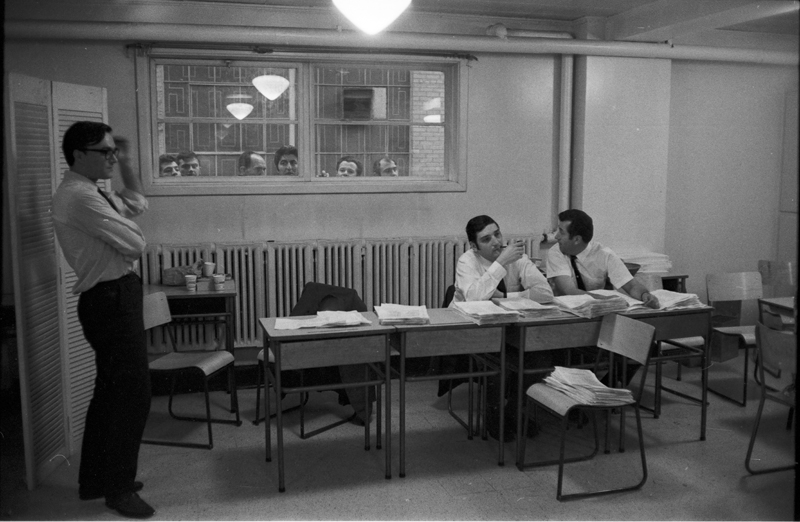 Image of one man standing and two men seated at wooden table. Six people can be seen peering through the window behind them.