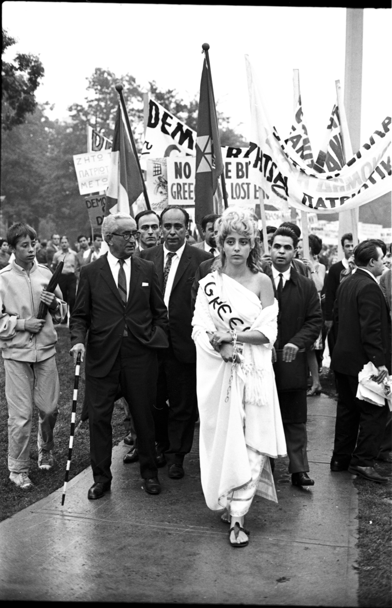Image of crowd at a rally at Queen's park. A woman dressed up symbolically as Greece leads the procession in chains. A crowd of men with banners follow behind her.
